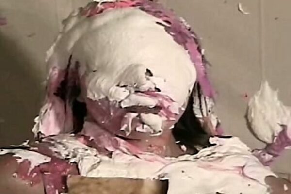 Wearing torn leggings and a black top, playing in a mud pit with a plank across it. She keeps falling into the mud, then pulling herself up to make a show of the way it clings to her body.