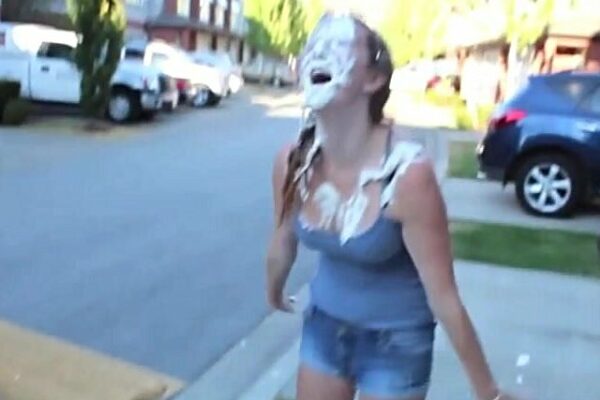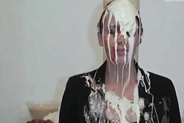 Woman is used as human garbage disposal. Covered in savoury foods and humiliated